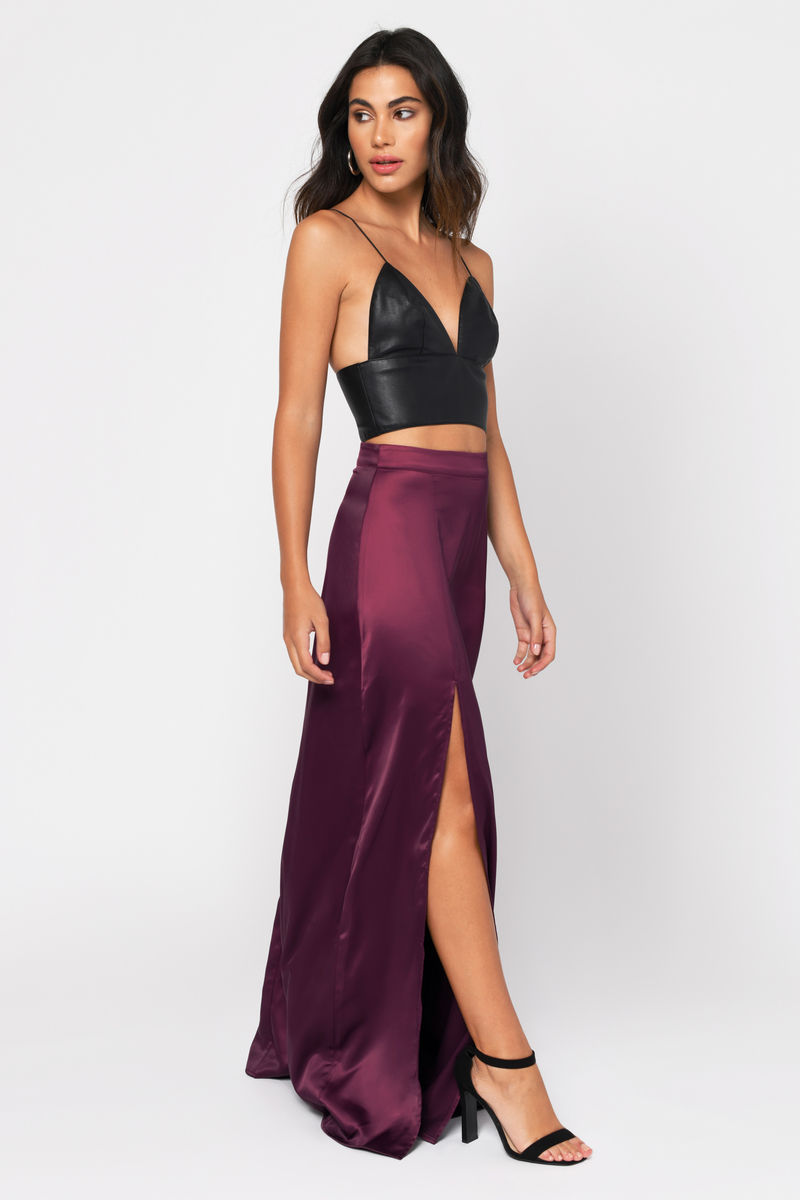 Here’s a tall order of satin comin’ your way. Wear the All Of Me Wine Satin Maxi Skirt at your next semi-formal event. This side split maxi skirt features a high waisted construction, satin finish, and a sexy thigh high slit. Pair this elegant skirt with a formal crop top and peep toe heels.
