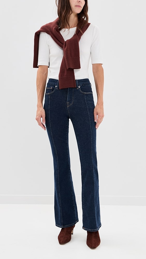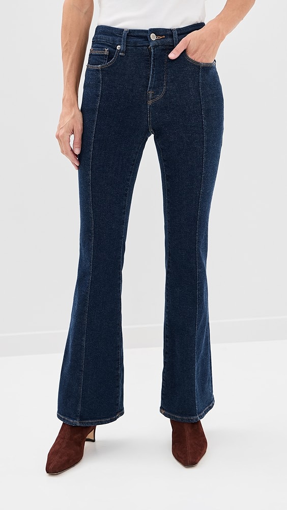 A fresh pair of Good American's mid-rise Petite jeans, rendered in heavily faded denim with plenty of comfortable stretch and finished with flared cuffs.